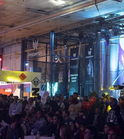 Идея: создание акцентной зоны — поднятого под потолком стенда "Predator", разделяющий пространство на три тематические зоны: игровую, презентационную и зону активных коммуникаций