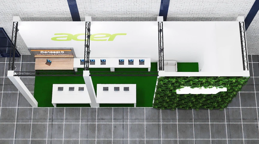 Стенд "Acer", напротив, излучал ламповую атмосферу с доминированием травы и света, функционально представляя собой просторную демо-зону. Для максимального комфорта посетителей в зону "Acer" мы интегрировали комнату-кабинет для переговоров и секцию хранения. Одно из дизайнерских решений, притягивающих внимание — бренд-волл в виде бетонной стены с декором из живого овса и светящимся логотипом.